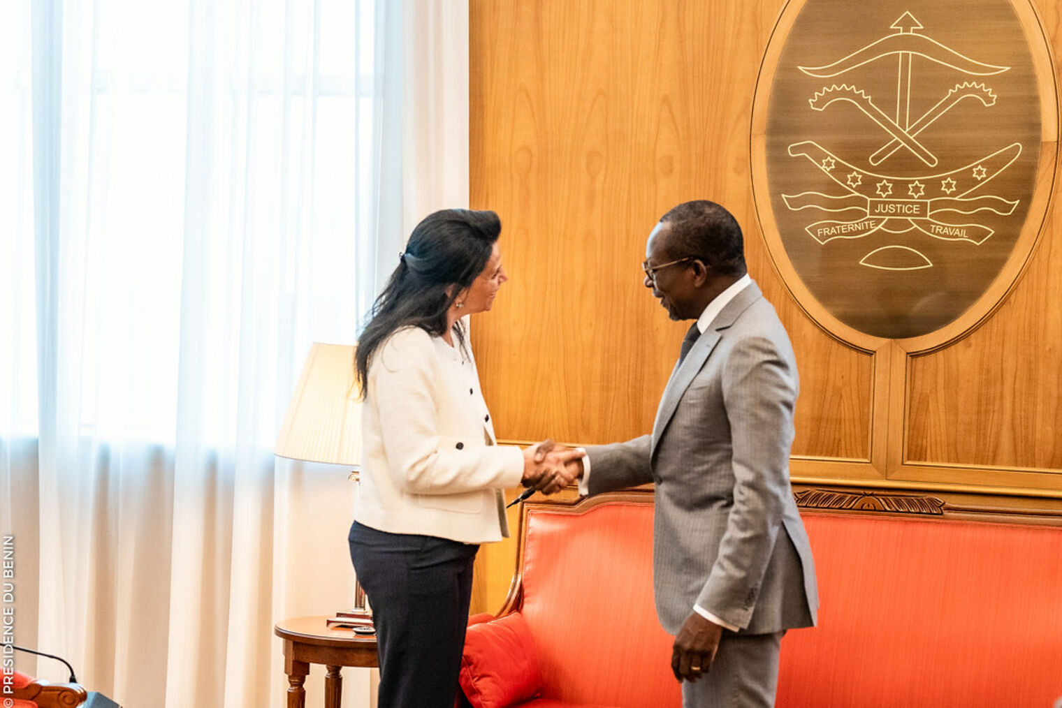 Depuis le mercredi 29 mars, la Secrétaire d’État française auprès de la Ministre de l’Europe et des Affaires étrangères, chargée du Développement, de la Francophonie et des Partenariats internationaux est en visite de travail au Bénin. À cette occasion, Chrysoula ZACHAROPOULOU est reçue en audience, ce jeudi 30 mars 2023 au Palais de la Marina, par le Président TALON. Le Ministre d’État, Ministre de l'Économie et des Finances Romuald WADAGNI et le Ministre des Affaires Étrangères et de la Coopération Aurélien AGBENONCI ont assisté à cette rencontre.