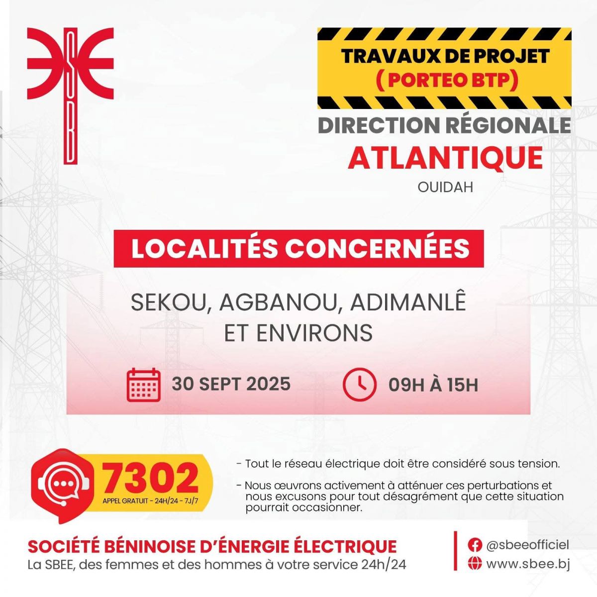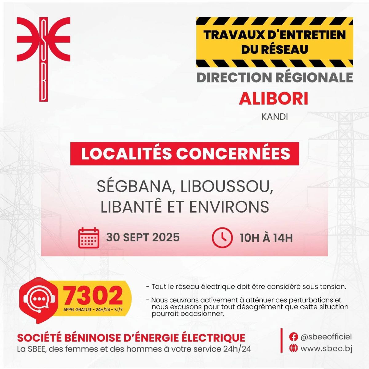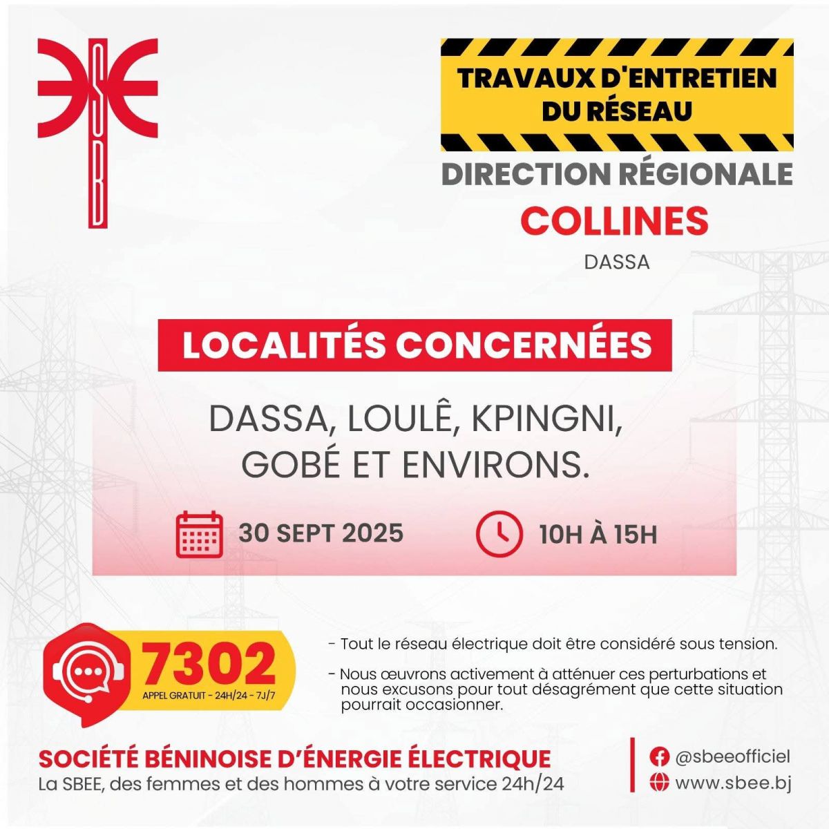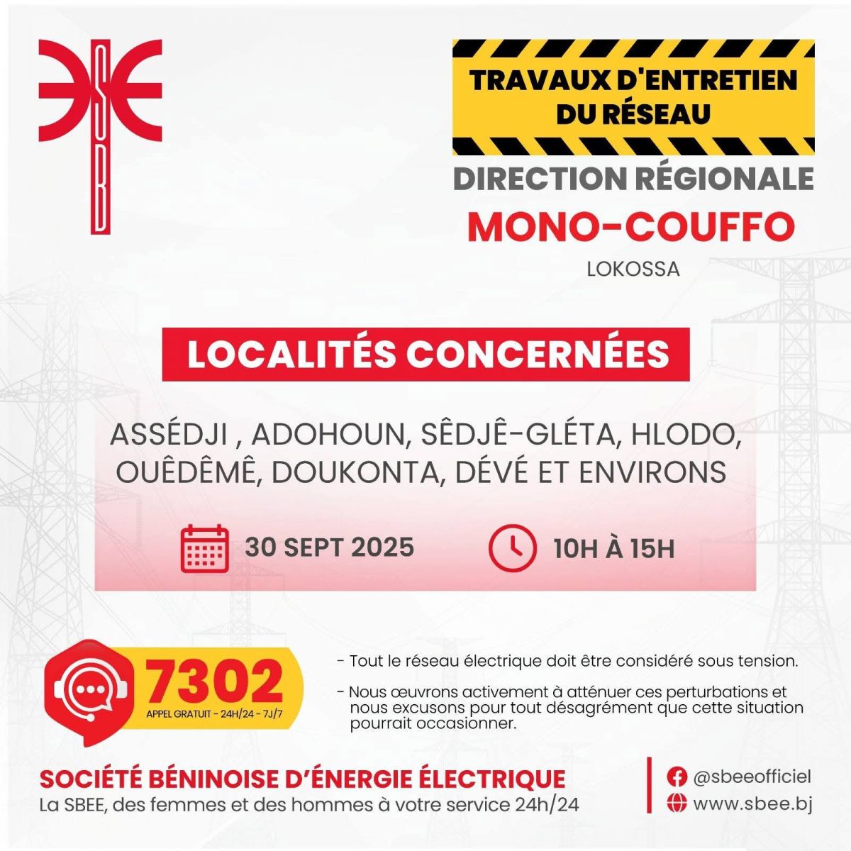 La Société Béninoise d’Énergie Électrique (SBEE) informe ses clients qu’elle procédera, en collaboration avec ses partenaires, à des travaux de maintenance le Mardi 30 Septembre 2025.