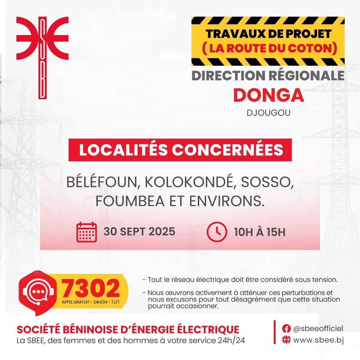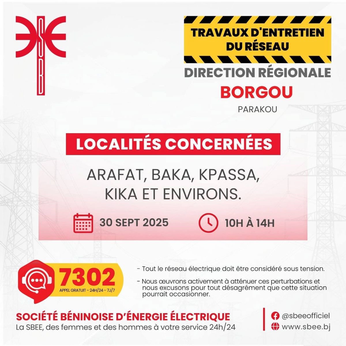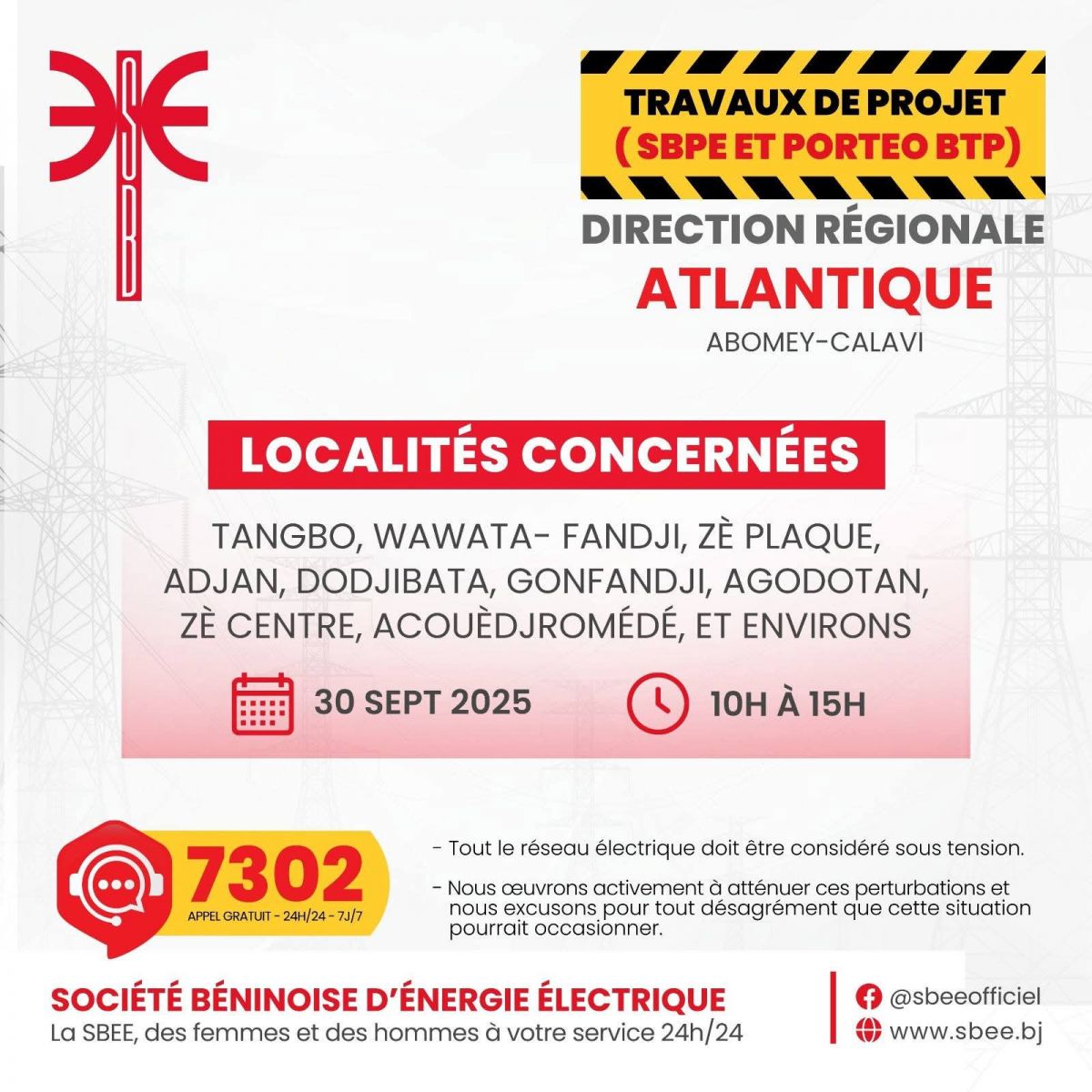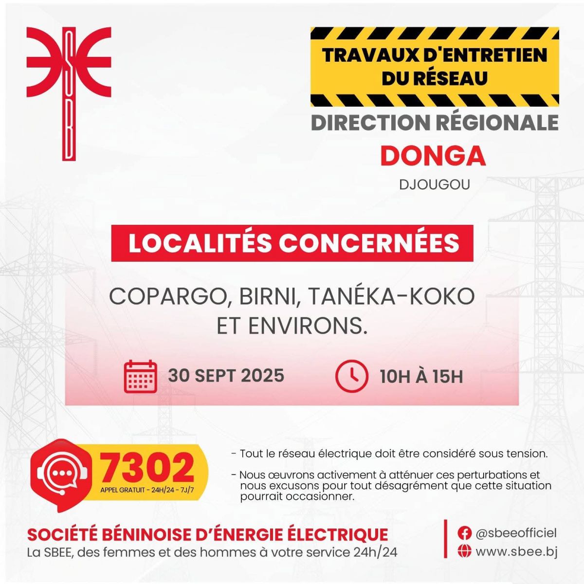La Société Béninoise d’Énergie Électrique (SBEE) informe ses clients qu’elle procédera, en collaboration avec ses partenaires, à des travaux de maintenance le Mardi 30 Septembre 2025.