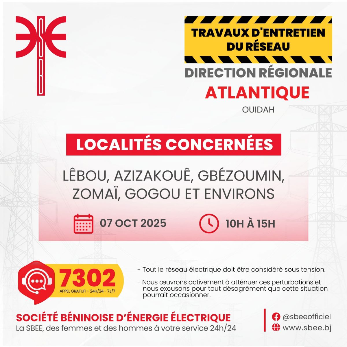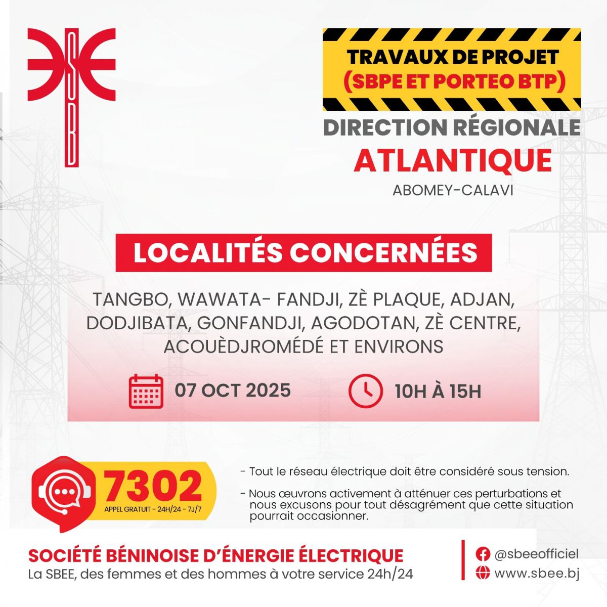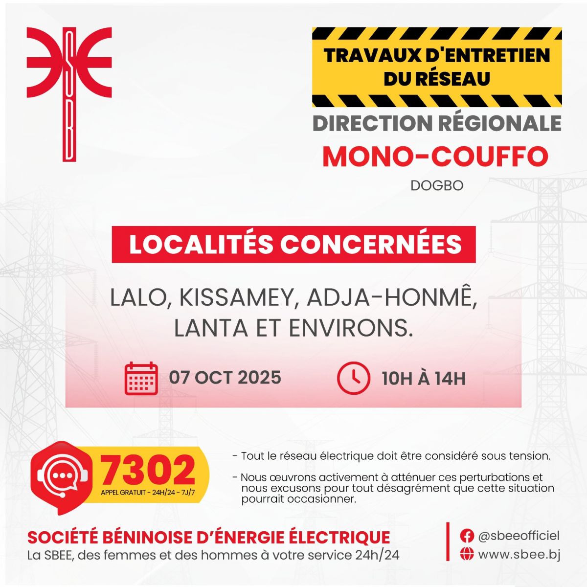 La Société Béninoise d’Énergie Électrique (SBEE) informe ses clients qu’elle procédera, en collaboration avec ses partenaires, à des travaux de maintenance le Mardi 07 Octobre 2025.