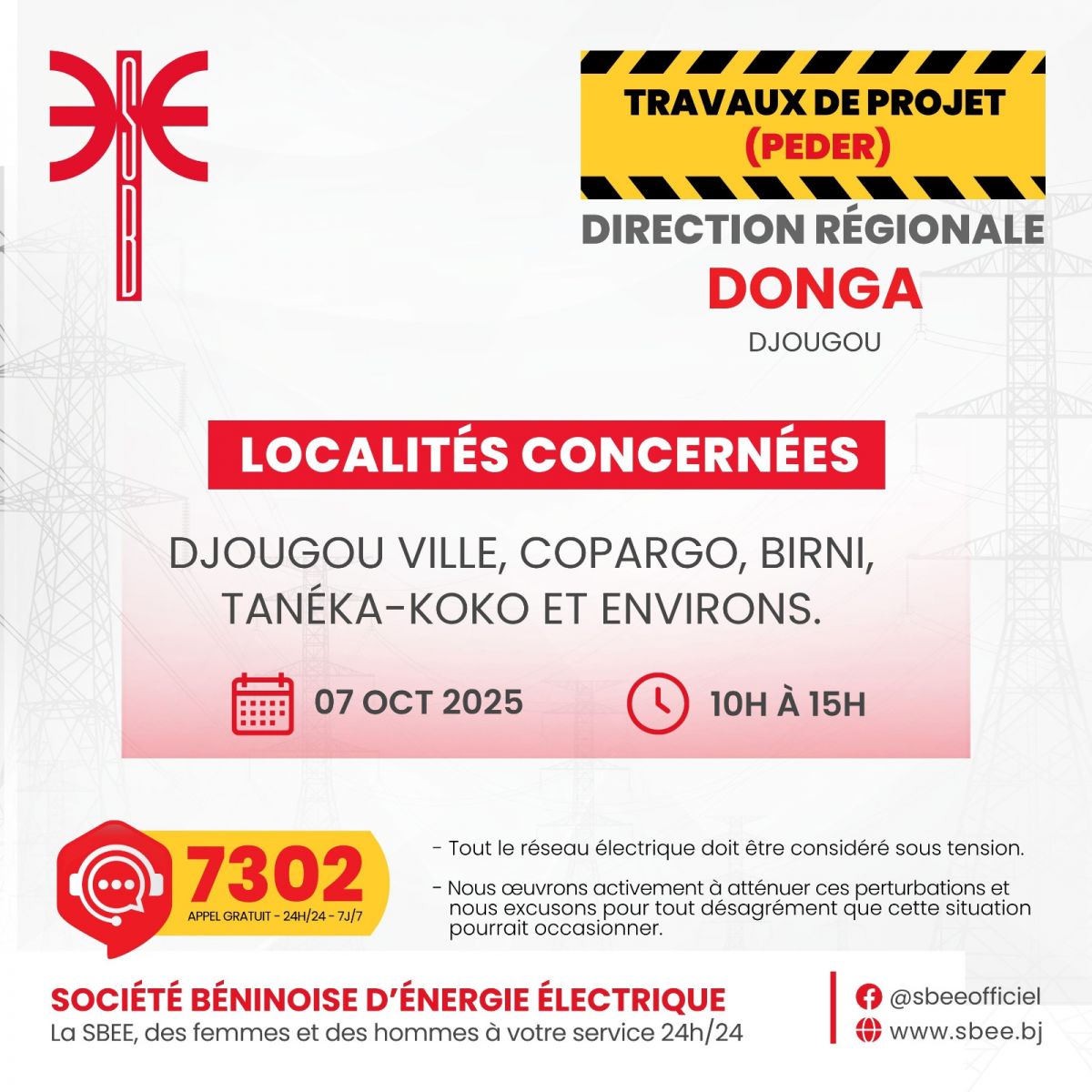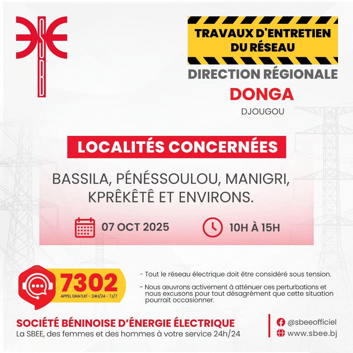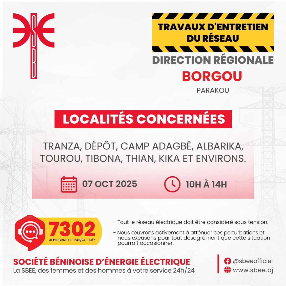 La Société Béninoise d’Énergie Électrique (SBEE) informe ses clients qu’elle procédera, en collaboration avec ses partenaires, à des travaux de maintenance le Mardi 07 Octobre 2025.