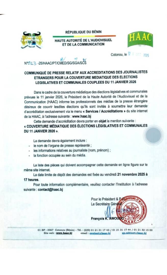 À l’approche des élections prévues pour le 11 janvier 2026 au Bénin, la Haute Autorité de l’Audiovisuel et de la Communication (HAAC) a émis un communiqué officiel précisant les modalités strictes d’accréditation applicables aux journalistes étrangers.