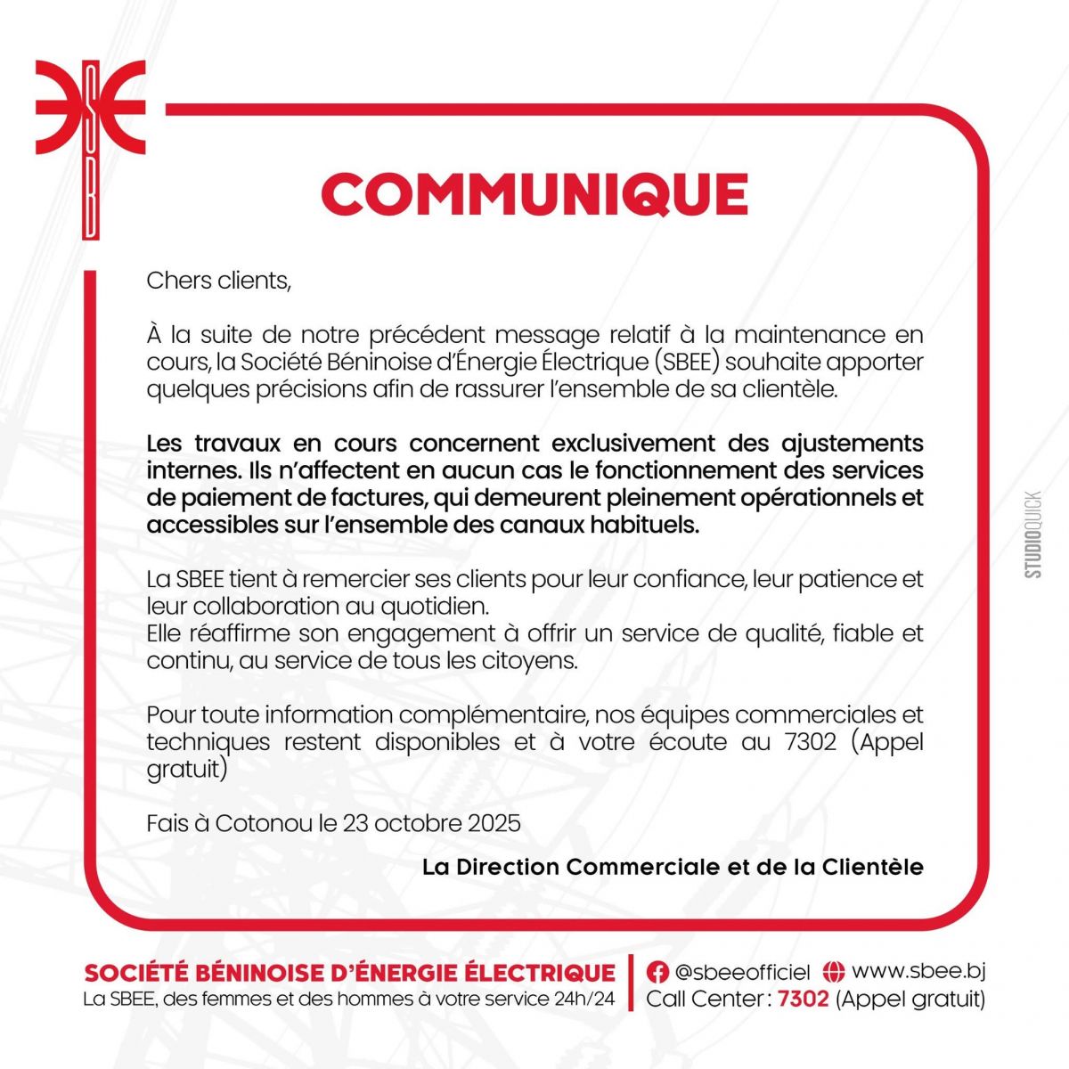 À la suite de notre précédent message relatif à la maintenance en cours, la Société Béninoise d'Énergie Électrique (SBEE) souhaite apporter quelques précisions afin de rassurer l'ensemble de sa clientèle.