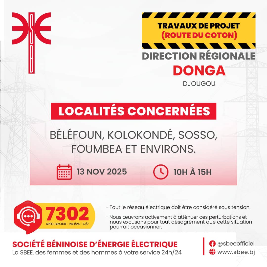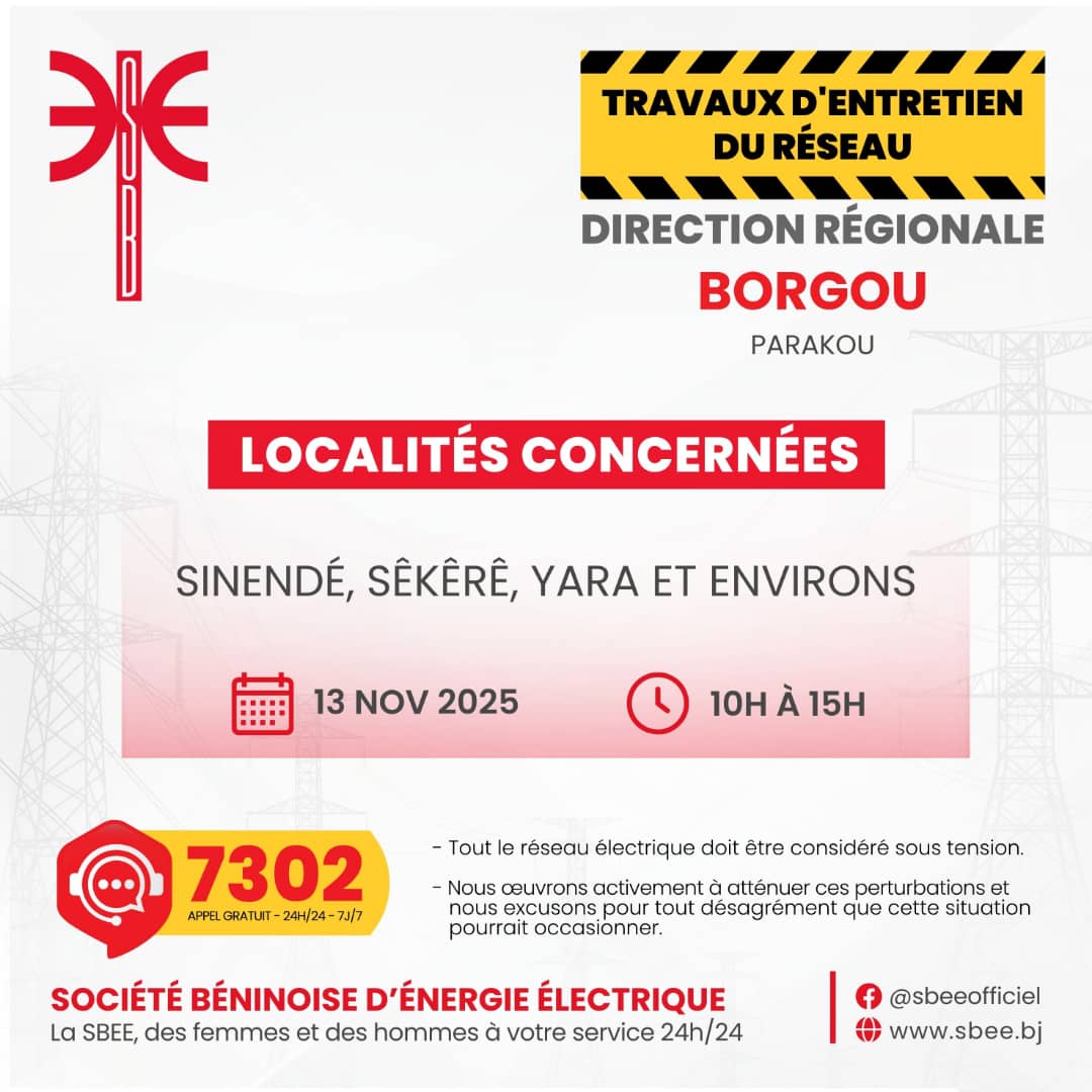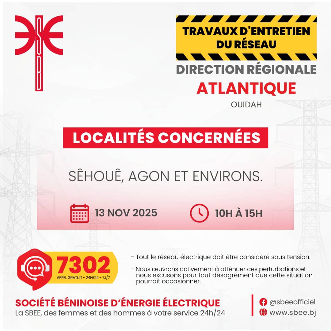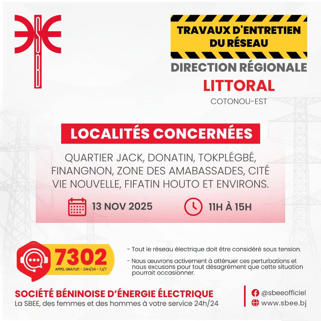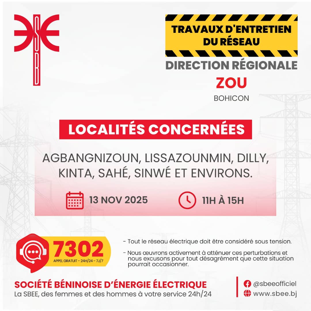 La Société Béninoise d’Énergie Électrique (SBEE) informe ses clients qu’elle procédera, en collaboration avec ses partenaires, à des travaux de maintenance le Jeudi 13 Novembre 2025.