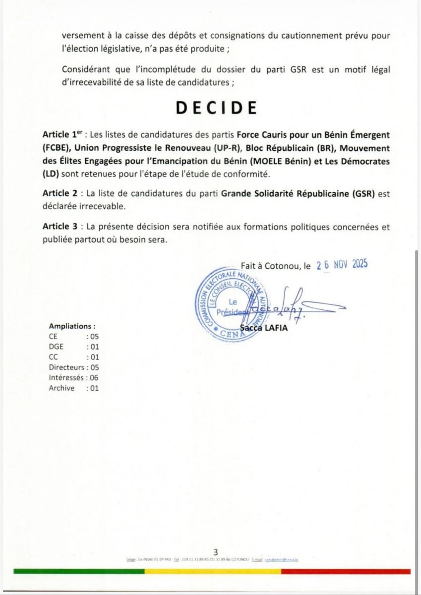 La Commission indique, dans l’Article 2, que la liste présentée par le parti Grande Solidarité Républicaine (GSR) a été jugée irrecevable. Aucun détail n’a pour l’instant été communiqué sur les raisons ayant motivé cette décision, mais des précisions pourraient intervenir dans les prochains jours.