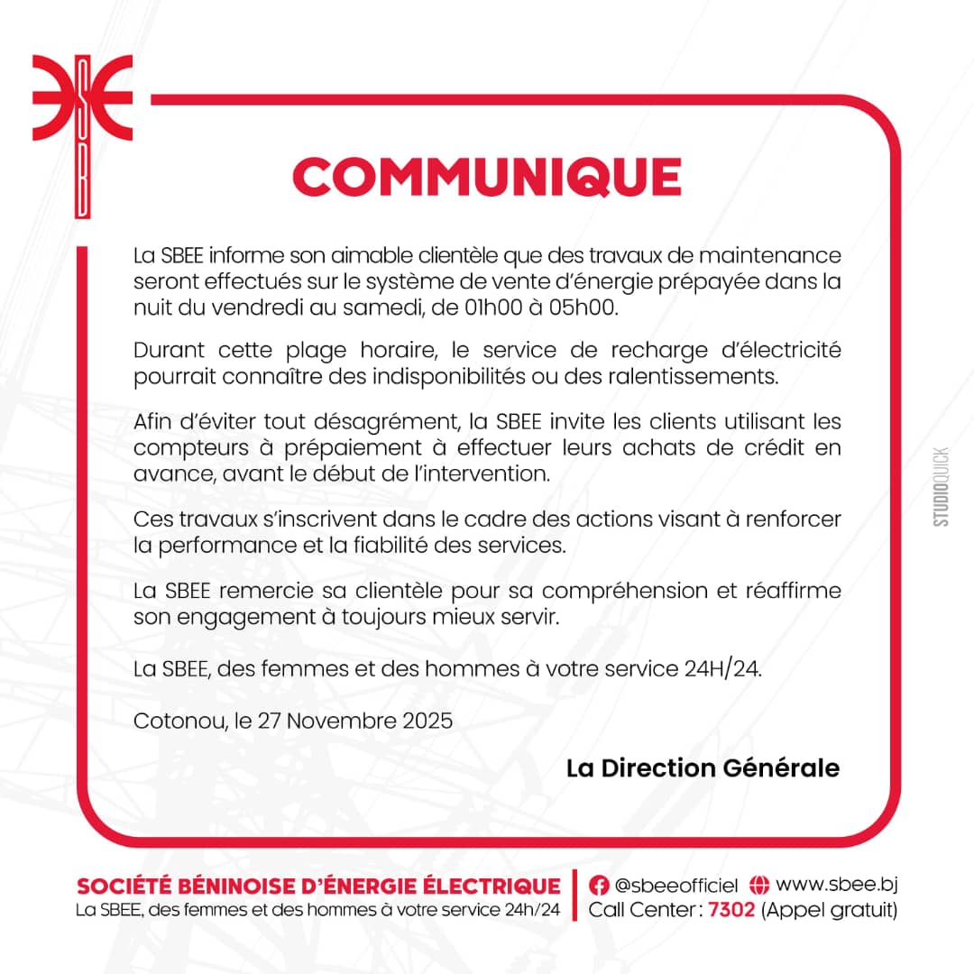 La Société Béninoise d’Énergie Électrique (SBEE) porte à la connaissance de sa clientèle qu’une opération de maintenance sera réalisée sur le système de vente d’énergie prépayée dans la nuit du Vendredi au Samedi, entre 01H 00 et 05H 00.