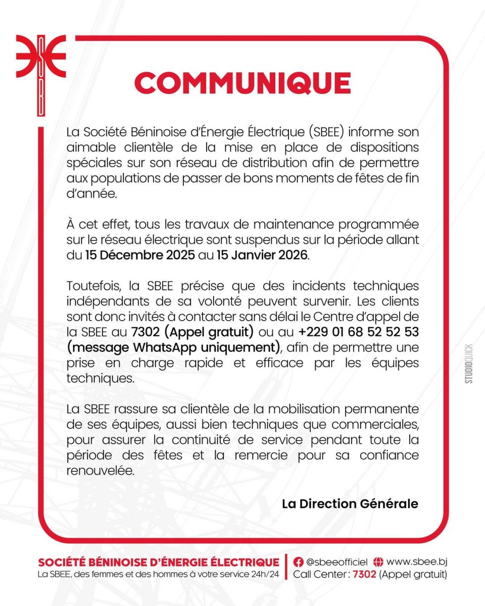 Toutefois, l’entreprise publique précise que des incidents techniques indépendants de sa volonté peuvent survenir. À cet effet, les clients sont invités à signaler sans délai toute anomalie en contactant le centre d’appel de la SBEE au 7302 (appel gratuit) ou via WhatsApp au +229 01 68 52 52 53, afin de permettre une intervention rapide des équipes techniques.